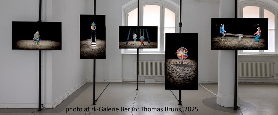 Die sich ständig wiederholenden Bewegungen finden ihre Entsprechung im Videoloop. Die einzelnen Szenen werden auf 5 Flachbildschirmen im Quer- und Hochformat präsentiert. Auf jedem Video ist nur ein Gerät zu sehen, das von 4-5 Personen genutzt wird: eine Schaukel, eine Wippe, eine Rutsche, eine Drehkugel und ein Feder- oder Hüpftier.